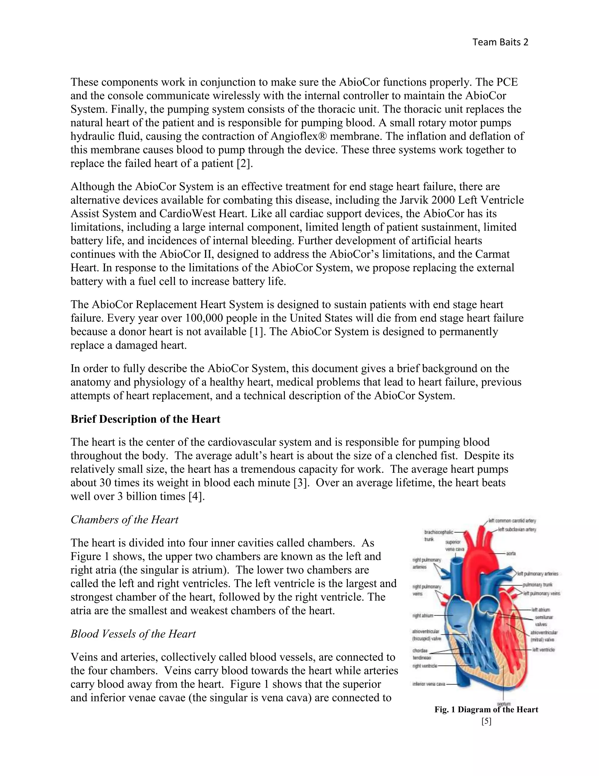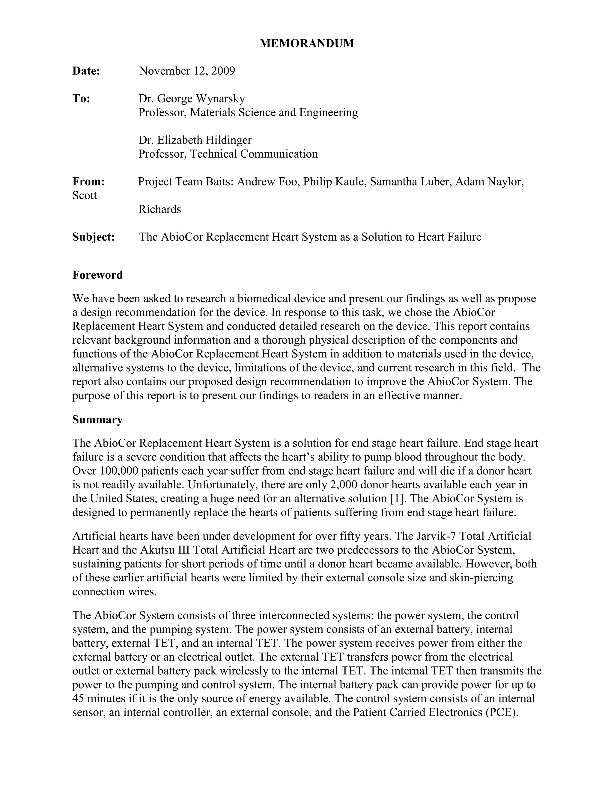 The report presents research on the AbiCor replacement heart system, designed to permanently replace the hearts of patients suffering from end-stage heart failure. It details the system's components, including its power, control, and pumping systems, while addressing the limitations of previous artificial hearts and proposing design improvements. The AbiCor system aims to address the severe shortage of donor hearts by providing an alternative solution for patients who would otherwise face death due to the unavailability of donor organs.