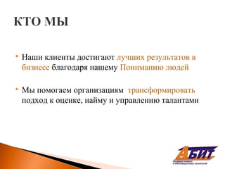 Документ представляет собой отчет Юлии А. Петровой о инструментах оценки потенциала сотрудников, направленных на улучшение бизнес-результатов клиентов через эффективное использование методов подбора и развития персонала. Указываются достижения компании, ключевые услуги, такие как тесты и обучение, а также результаты, включая увеличение производительности и уровень удержания сотрудников. Отчет подчеркивает важность индивидуального подхода к развитию, адаптации систем обучения и использования аналитики для принятия кадровых решений.