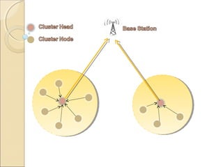 This document discusses generating sensor nodes and clustering for energy efficiency in wireless sensor networks (WSNs). It describes how sensor nodes are organized into clusters with a cluster head that communicates with the base station. The presentation proposes an algorithm for selecting the cluster head based on the node's distance to the base station and other nodes, with the goal of increasing network lifetime by optimizing energy consumption. Clustering helps reduce energy usage through data aggregation and limiting transmissions to cluster heads only.