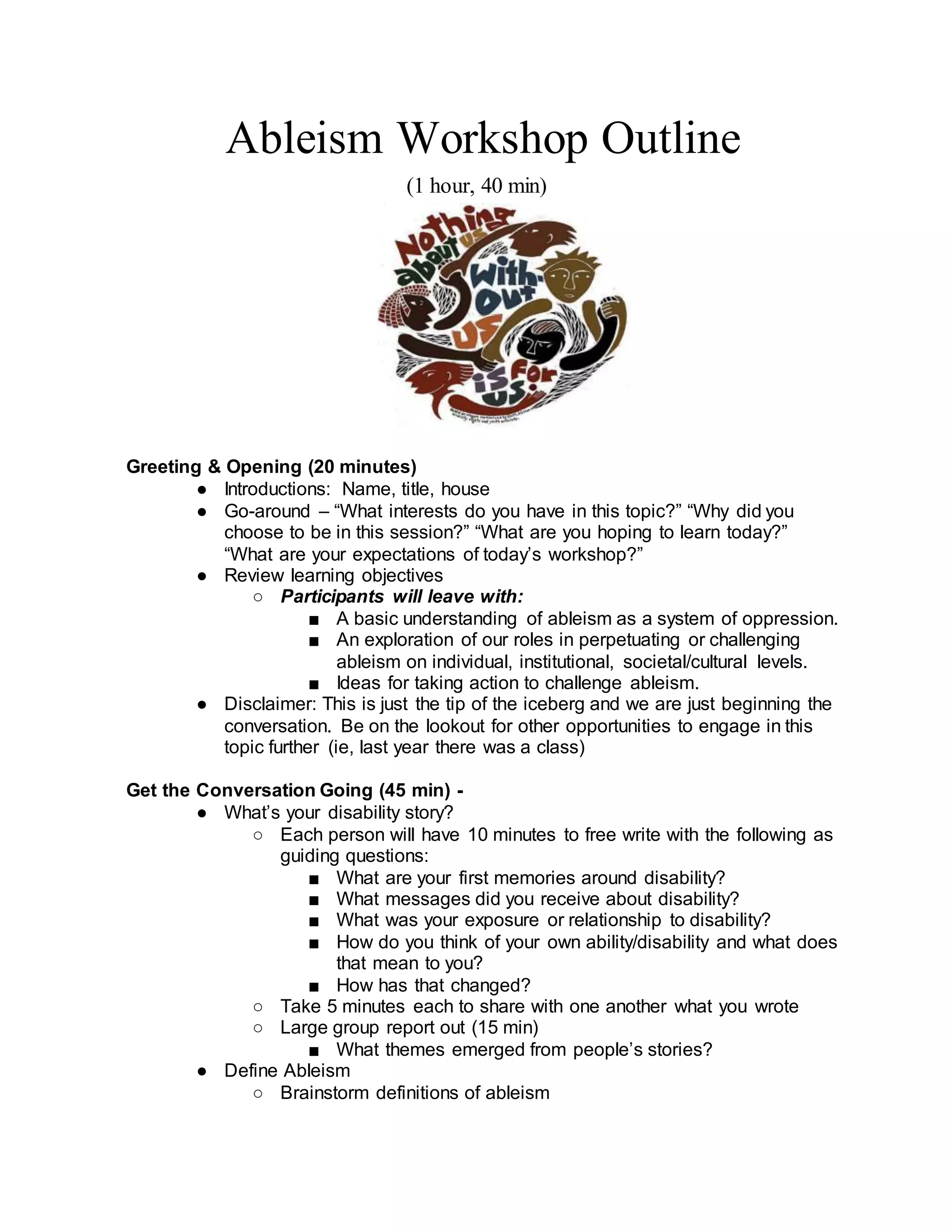 This document outlines a two-day ableism workshop with the following objectives: (1) give participants a basic understanding of ableism as a system of oppression, (2) explore how ableism manifests on individual, institutional and societal levels, and (3) provide ideas for challenging ableism. The workshop uses discussion, activities and videos to define ableism, examine privileges, consider social constructs of disability, and brainstorm allyship and action. Participants are encouraged to reflect on their own experiences and roles in perpetuating or challenging ableism, and to commit to specific action steps toward creating a more just and inclusive world.
