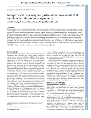 Integrin V can form heterodimers with several subunits to mediate cell-cell and cell-extracellular matrix interactions. During zebrafish gastrulation, V is expressed maternally and zygotically. Here, we used a morpholino-mediated V knockdown strategy to study V function. Although V morphants displayed vascular defects, they also exhibited left-right body asymmetry defects affecting multiple visceral organs. This was preceded by mislocalization of dorsal forerunner cells (DFCs) and malformation of the Kupffer’s vesicle (KV) laterality organ