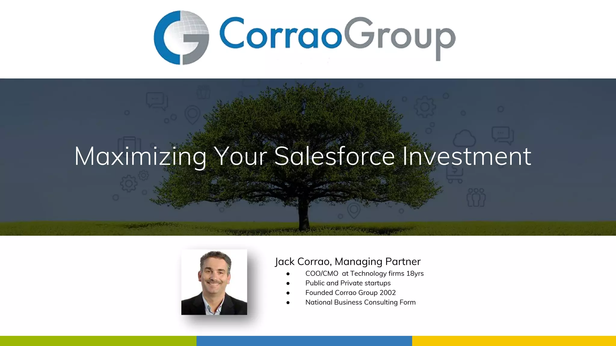 This document discusses how Corrao Group, a national business consulting firm, has helped clients maximize their investment in Salesforce over many years. It describes how they helped clients transition from manual, disjointed processes to integrated, automated systems using Salesforce, Pardot, and other tools. This provided benefits like real-time visibility, improved marketing and sales alignment, increased productivity, and better customer engagement. Case studies show impacts like higher response and conversion rates, faster cash flow, and better management of large pipelines. The document promotes Corrao Group's services and experience in custom Salesforce solutions and Account-Based Marketing.