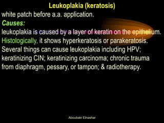1. Leukoplakia appears as a thick white patch on the epithelium before acetic acid is applied.