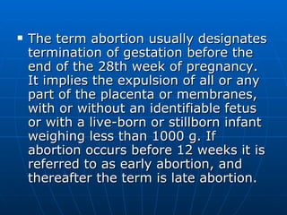 The document discusses different types of abortion including threatened abortion, inevitable abortion, incomplete abortion, complete abortion, missed abortion, and recurrent abortion. It describes the causes, signs, symptoms, management, and risks associated with each type. The main causes of abortion discussed are infections, environmental exposures, psychological factors, systemic disorders, endocrine factors, uterine abnormalities, trauma, and fetal factors like genetic abnormalities.