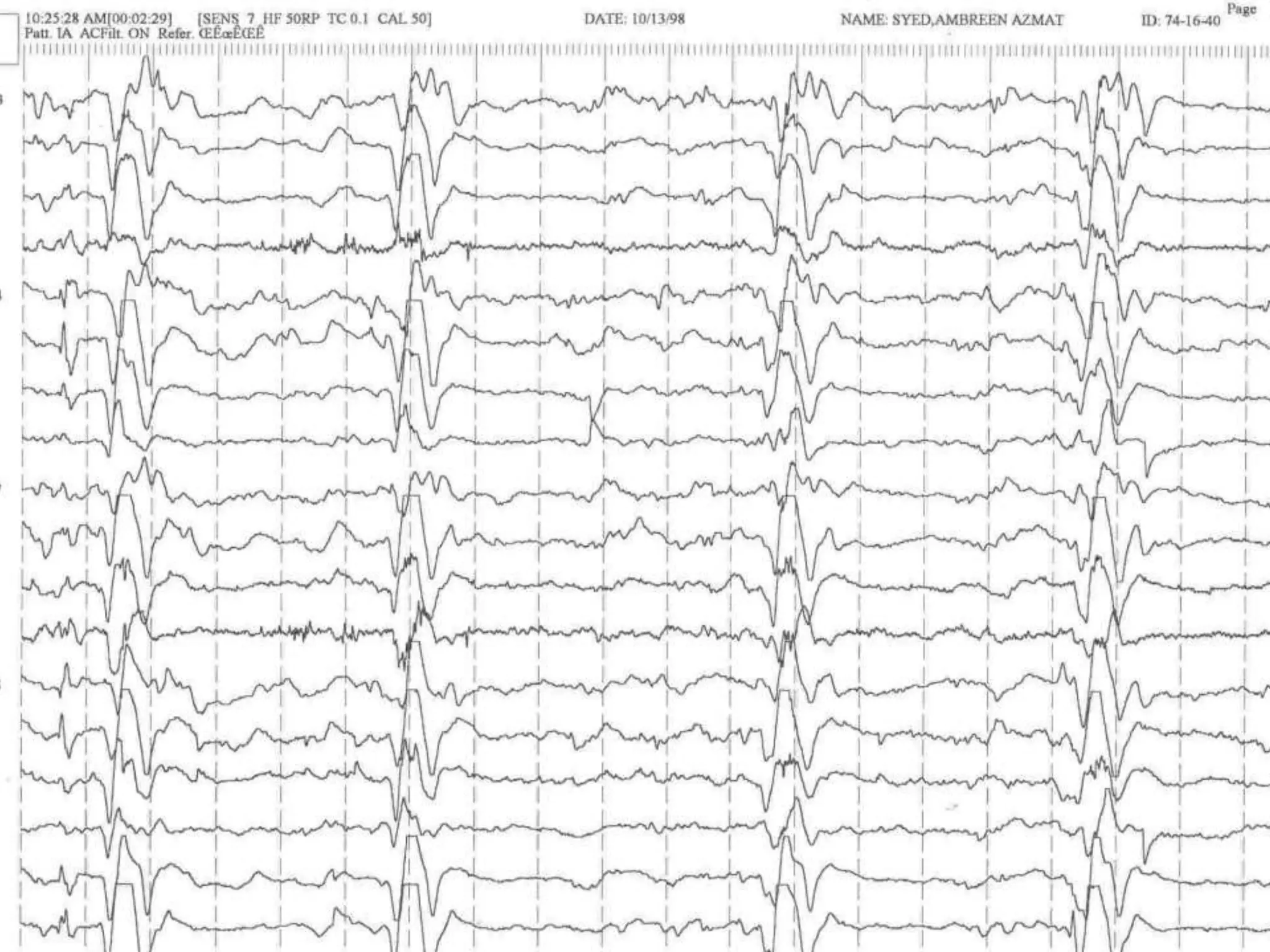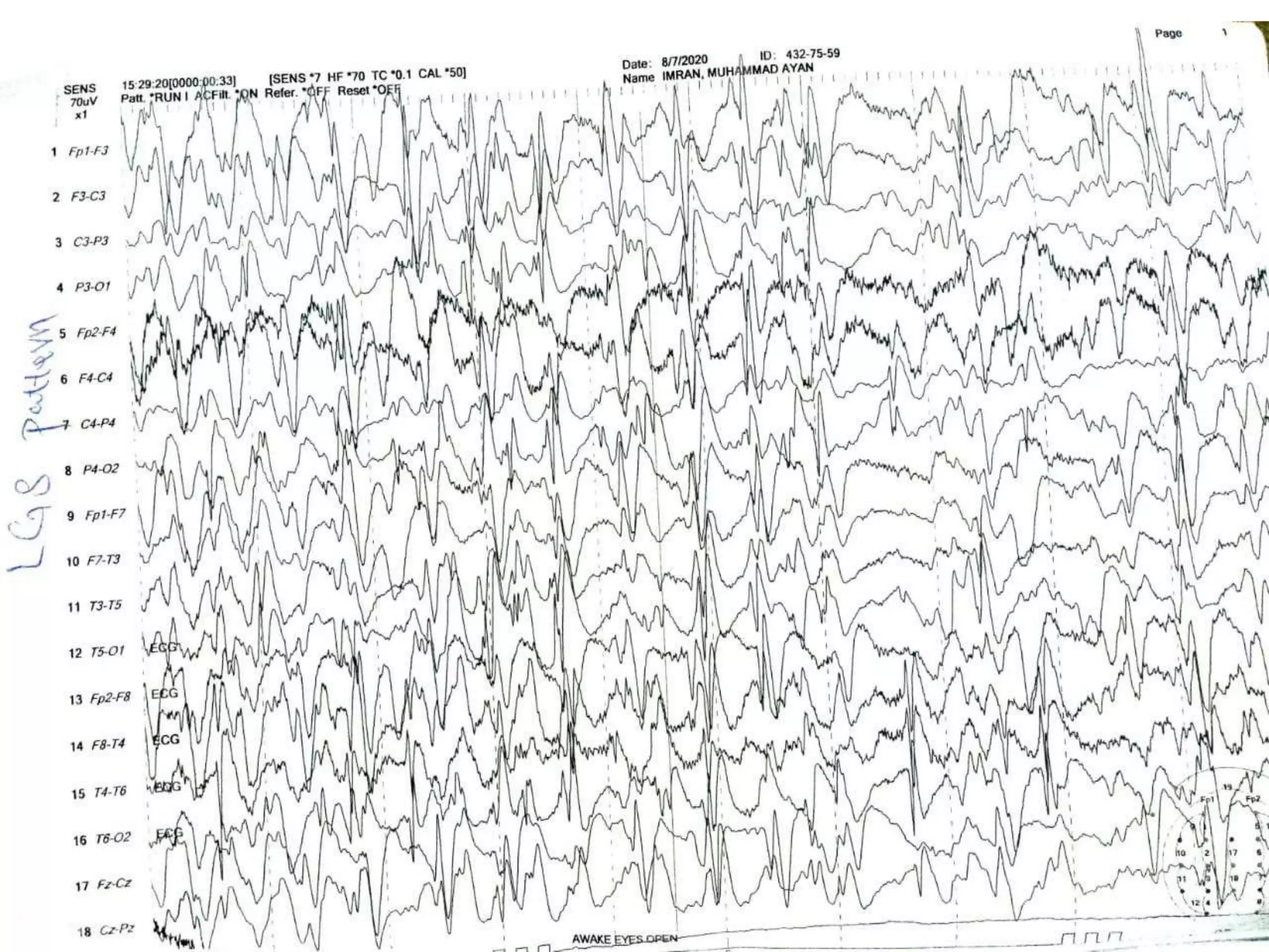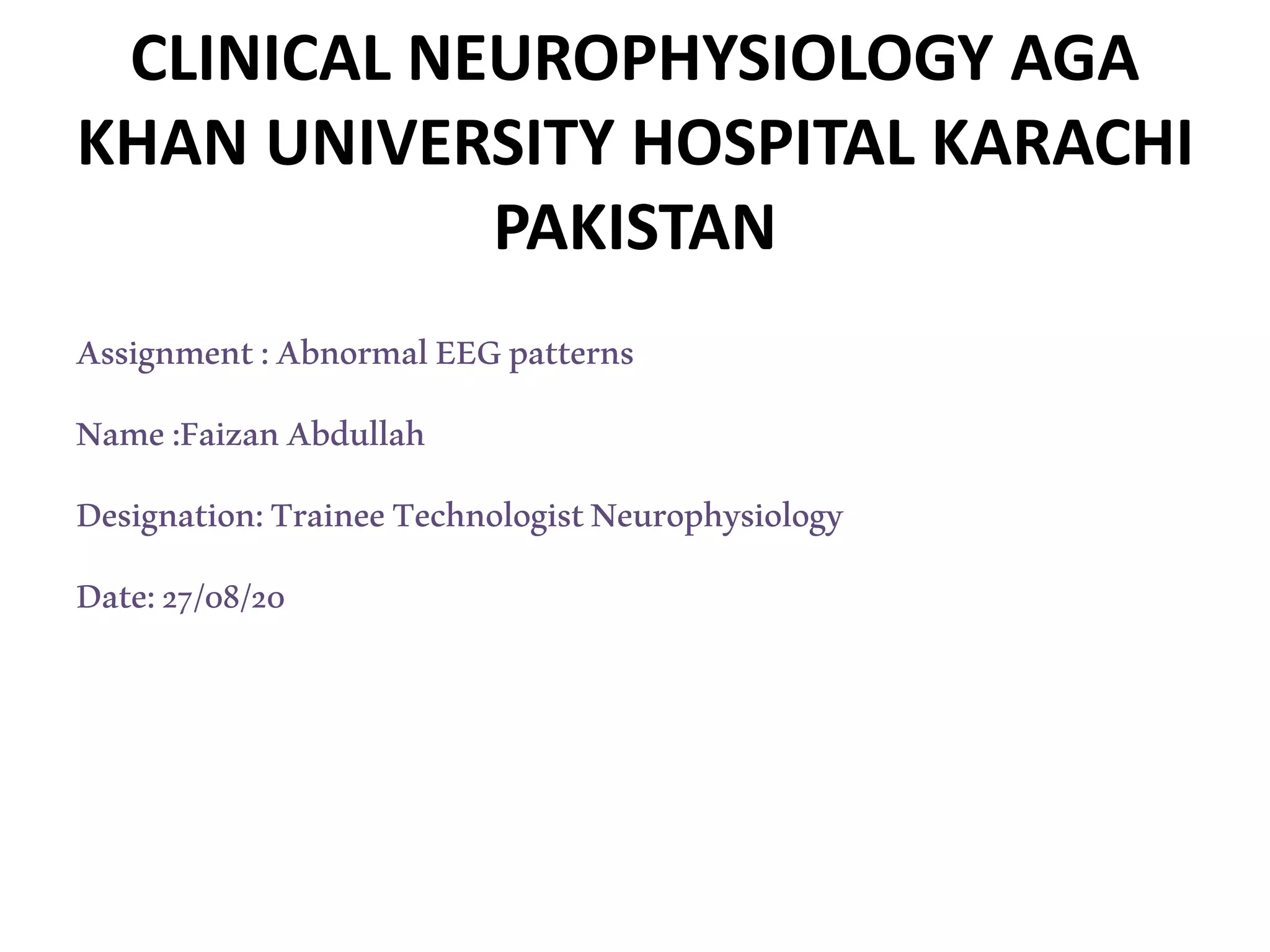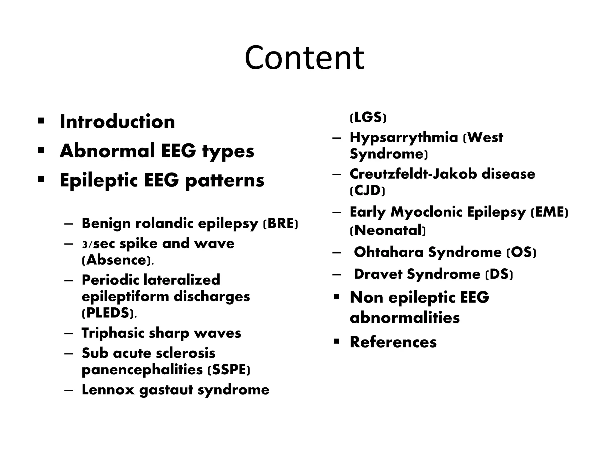 This document discusses various abnormal EEG patterns, including both epileptic and non-epileptic abnormalities. It provides details on specific epileptic patterns such as benign rolandic epilepsy, 3Hz spike and wave patterns indicative of absence seizures, periodic lateralized epileptiform discharges, and other conditions including Lennox Gastaut syndrome and Creutzfeldt-Jakob disease. It describes the characteristic EEG findings, clinical symptoms, age of onset and other factors for each of these abnormal patterns.