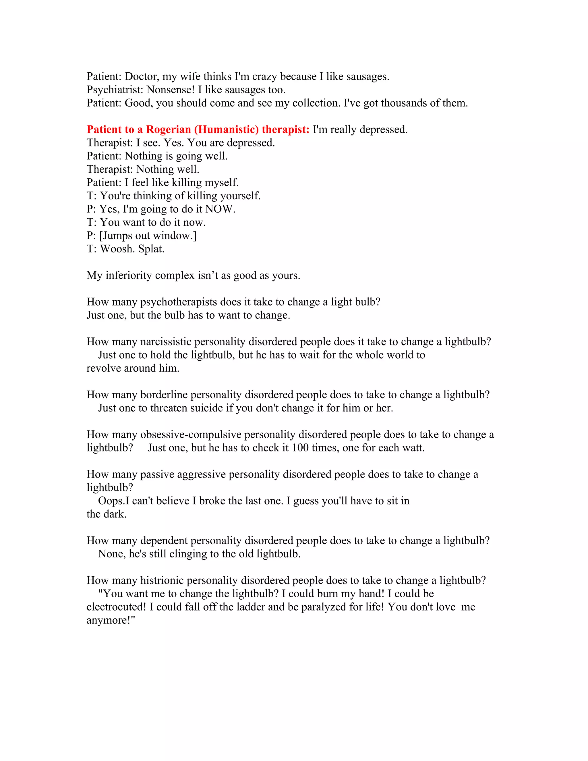 The document contains several jokes and examples related to psychotherapy and personality disorders. It includes a conversation between a patient and therapist where the patient jumps out a window, as well as jokes poking fun at different personality disorders and how many people with each disorder it would take to change a lightbulb. The lightbulb jokes highlight characteristic traits of different personality disorders.