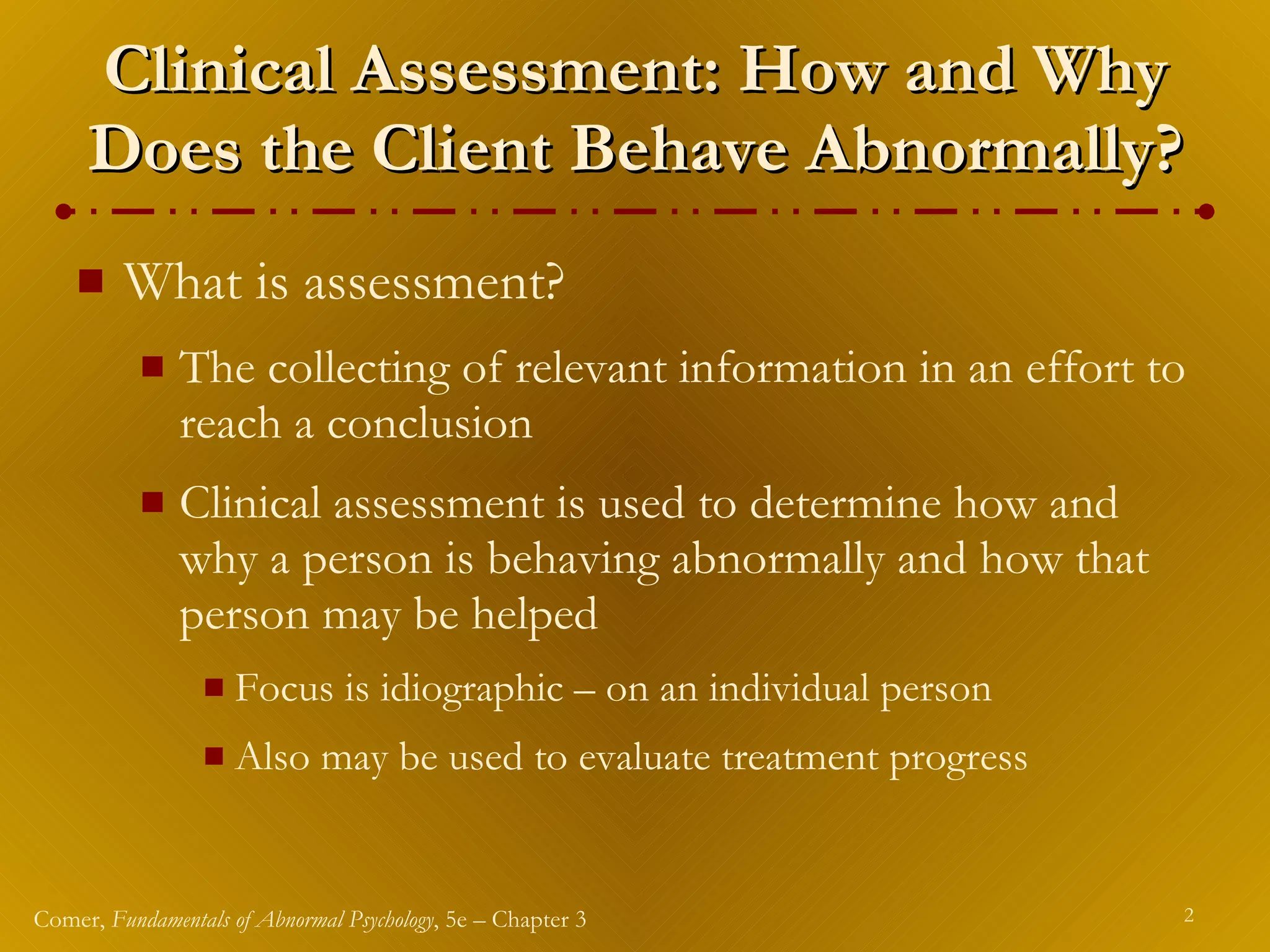 Clinical assessment involves collecting information to determine how and why a person is behaving abnormally and how they can be helped. Clinicians use clinical interviews, tests, and observations as assessment tools, which must be standardized, reliable, and valid. The DSM-IV-TR is commonly used for diagnosis and describes diagnostic criteria across five axes. Treatment decisions are based on assessment and diagnosis information, with the goal of empirically supported and evidence-based therapies. Research shows that therapy is generally more effective than no treatment, though some therapies may be more effective than others for specific problems.
