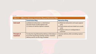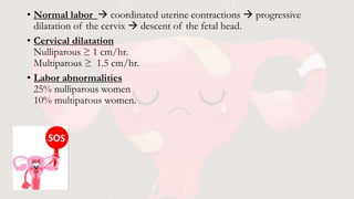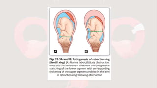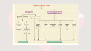 This document summarizes various types of abnormal uterine action that can occur during labor and delivery. It describes normal labor progression and defines abnormalities as any deviation from the normal pattern of uterine contractions that affects the course of labor. Various types of abnormalities are outlined, including dysfunctional labor, uterine inertia, incoordinate uterine action, cervical dystocia, and precipitate labor. Causes, diagnostic features, effects on the mother and fetus, and management approaches are provided for each abnormality.