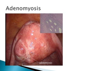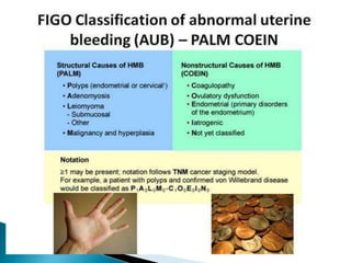 The document summarizes information about the menstrual cycle and abnormal uterine bleeding. It describes the typical phases and hormone levels during a normal menstrual cycle. It then defines and categorizes different types of abnormal uterine bleeding and lists potential structural and non-structural causes. The document outlines evaluation and treatment approaches, including general measures, medical management, minimally invasive procedures, and major surgery.