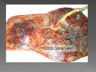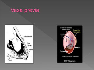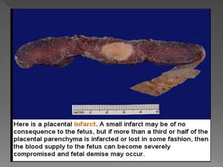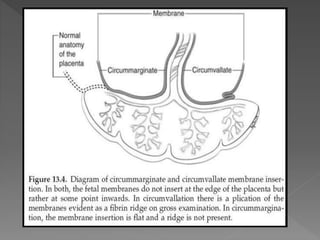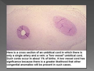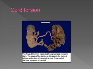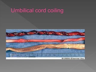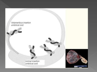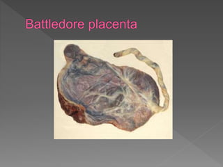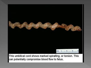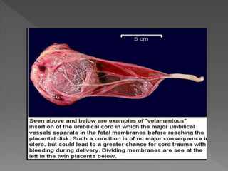 The document summarizes various placental and umbilical cord abnormalities. It describes the typical shapes of most placentae as round or oval but notes that variations are common, including multiple placentae or bilobed placentae. It also discusses abnormalities in placental structure, cord insertion sites, umbilical cord vessels, and other variations that can occur in the placenta and umbilical cord. Many of these abnormalities are associated with risks like abnormal fetal growth, preterm delivery, fetal distress, or hemorrhage. The document provides details on the incidence, risk factors, pathogenesis, and clinical implications of numerous placental and umbilical cord variations.
