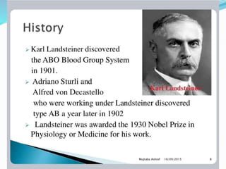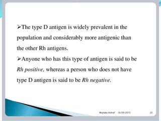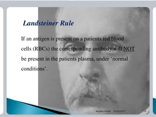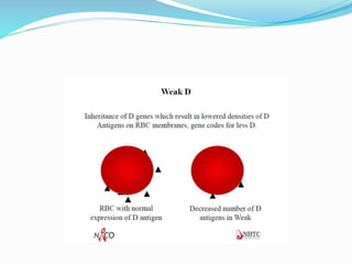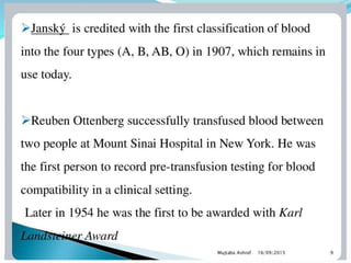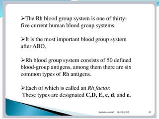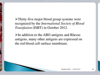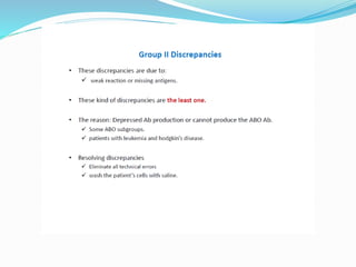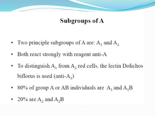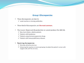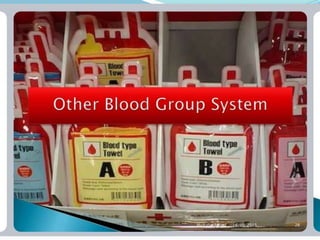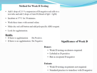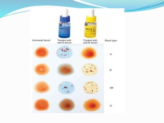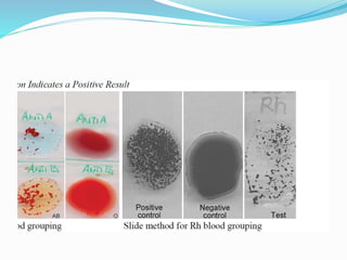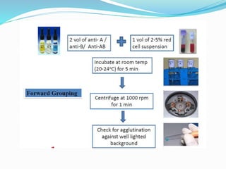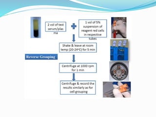 This document discusses the importance of blood grouping and provides information about ABO and Rh blood group systems. It explains that blood grouping is done to ensure safe blood transfusions, as incompatible blood types can cause agglutination of red blood cells. ABO blood grouping identifies the presence of A and B antigens on red blood cells and corresponding anti-A and anti-B antibodies in plasma. Rh blood grouping identifies the presence of the RhD antigen. The document outlines the procedures for performing forward and reverse blood grouping to determine a person's blood type according to these systems. It also discusses some rare blood types like the Bombay phenotype.