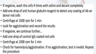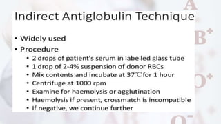 The document provides a comprehensive overview of blood grouping and cross-matching, focusing on various blood group systems, particularly the ABO and Rh systems, which are crucial for blood transfusions. It explains the genetics behind these blood groups, methods for testing blood types, and the clinical significance of different blood group subtypes, including the rare Bombay blood group. The document also details procedural techniques for conducting blood grouping tests and cross-matching to ensure compatibility before transfusions.