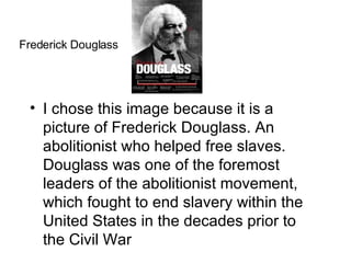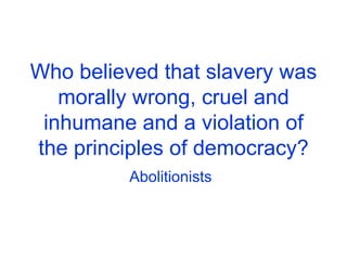 Abolitionists believed that slavery was morally wrong and violated democratic principles, and the document discusses Frederick Douglass and John Brown, two prominent abolitionist leaders - Frederick Douglass helped free slaves and was a leader of the abolitionist movement fighting to end slavery before the Civil War, while John Brown attempted to start a slave liberation movement at Harper's Ferry in 1859.