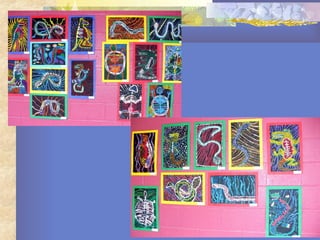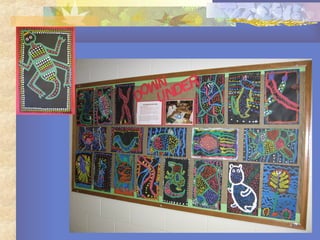 Aboriginal art developed over 40,000 years in Australia and is closely tied to Aboriginal beliefs and culture, with different styles of art reflecting Dreamtime stories, body decoration, and X-ray paintings depicting animal anatomy. Traditional Aboriginal art includes rock paintings, bark paintings, sand and body paintings, with natural pigments depicting ancestral beings and symbols important to Aboriginal spiritual and cultural practices.
