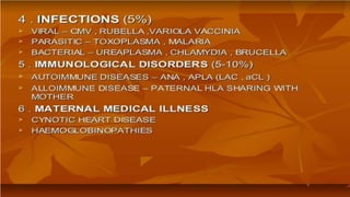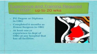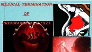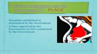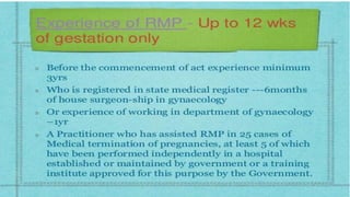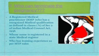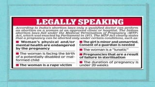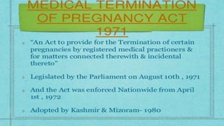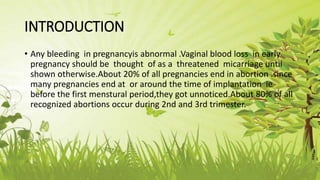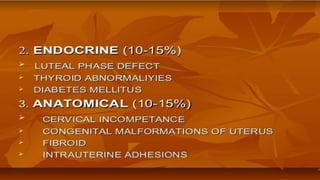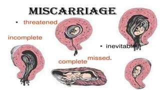 This document discusses various types of abortion including spontaneous, threatened, inevitable, incomplete, complete, missed, recurrent, septic, induced, and illegal abortions. It defines each type, describes their signs and symptoms, and outlines recommended management and treatment approaches. Complications of abortion are also reviewed along with methods for termination of pregnancy in the first and second trimesters.
