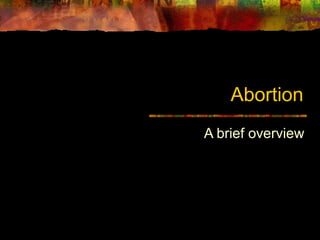 This document provides an overview of abortion including terminology, statistics, development of human life from conception through the stages of pregnancy, methods of abortion, Christian views, and references to human life in the Bible. It discusses key topics in the abortion debate such as when human life begins, the morality of ending unborn life, exceptions for health risks or disabilities, and views from different religions. The document aims to present factual information on abortion without taking a stance on the issues.