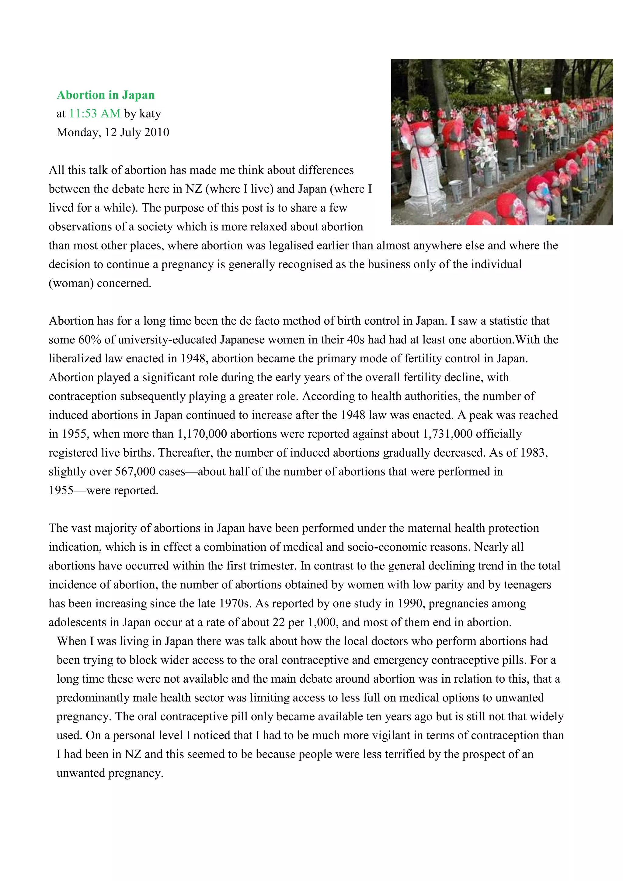 Abortion has long been widely accepted and used as a method of birth control in Japan. It was legalized in 1948 and by 1955 over 1 million abortions were performed annually, though that number has declined. Abortions are generally performed within the first trimester and for socio-economic or medical reasons. Traditionally in Japan, personhood was not attributed to a fetus until after birth, so abortion was not considered taking a life. The decision to continue a pregnancy is seen as a private choice for the woman. Rituals like Mizuko Jizo provide a way for women to acknowledge abortions or miscarriages.