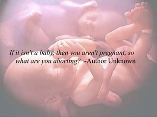 This document discusses abortion from several perspectives. It defines abortion and different types, including spontaneous abortion (miscarriage), therapeutic abortion, and elective abortion. It describes various medical abortion methods used at different gestational periods, and discusses the historical background of abortion practices and laws over time in various cultures and countries. The document also specifically outlines Guyana's 1995 Medical Termination of Pregnancy Act, defining key terms and outlining counseling requirements and laws regarding termination of pregnancy within different gestational period thresholds.