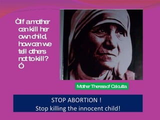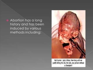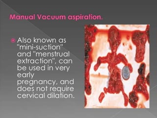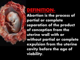 This document defines various types of abortion and provides details about their management. It discusses spontaneous abortions including threatened abortion, inevitable abortion, incomplete abortion, complete abortion, missed abortion, and septic abortion. It also covers induced/electoral abortions, which may be legal under the MTP Act or illegal. Nursing responsibilities are outlined for assessing, planning, implementing, and evaluating care for patients experiencing different types of abortions.