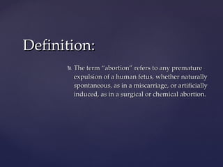 The document discusses various topics related to abortion including its definition, history of legalization, statistics on who receives abortions and at what gestational ages, fetal development, types of abortion procedures, risks of abortion, and perspectives on the abortion debate. It provides statistics on abortions in the US such as over 50 million worldwide since 1973 and 1.3 million annually in the US. It also outlines fetal development from heartbeat at 3 weeks to dreaming in the womb at 32 weeks. The types of abortion procedures described include suction, D&C, saline injection, and partial-birth abortion. Risks mentioned include death, cancers, and emotional issues.