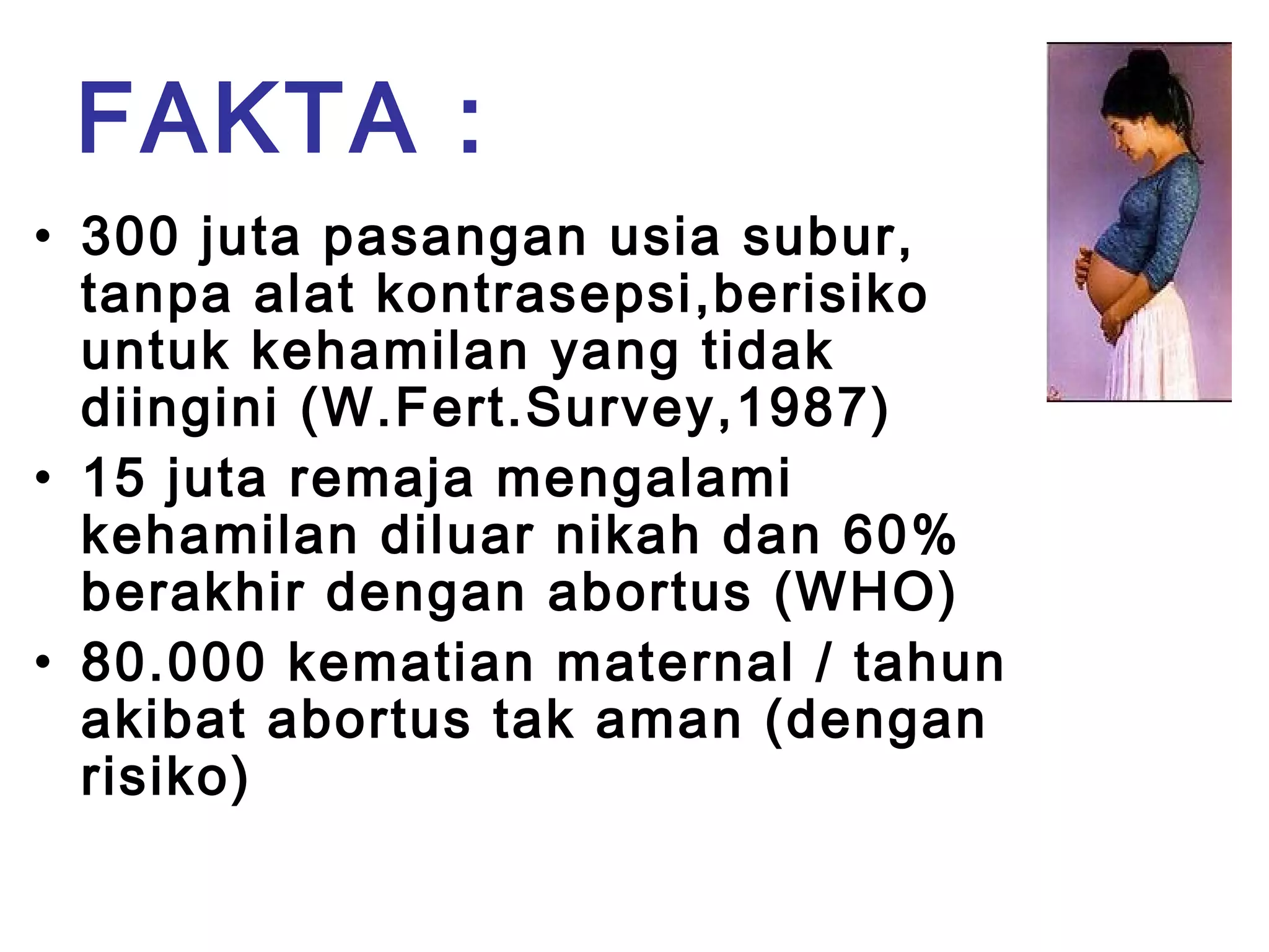 Dokumen tersebut membahas tentang abortus provokatus secara medis dan hukum. Secara medis, abortus adalah pengeluaran janin sebelum usia 20 minggu kehamilan atau berat janin kurang dari 500 gram. Secara hukum di Indonesia, abortus diatur dalam KUHP dan dapat dikenai sanksi hingga 15 tahun penjara. Dokumen juga menyinggung masalah kehamilan yang tidak diinginkan, komplikasi kesehatan akibat abortus tak a