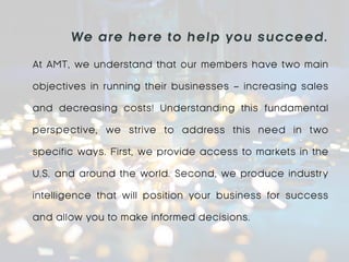 AMT aims to support its members' business objectives of increasing sales and reducing costs by providing market access, industry intelligence, networking opportunities, and cutting-edge technology insights. The document details various AMT products and services designed to aid businesses, along with upcoming events and initiatives to promote industry engagement. It emphasizes the importance of a collaborative approach in the manufacturing sector for sustained growth and competitive advantage.