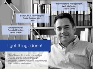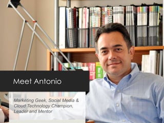 Antonio is a marketing geek and technology champion with experience in product/brand management, web marketing, social media, SaaS/Cloud technologies, and CRM. He has led teams to create visions and see projects through from inception to completion. The document provides details on Antonio's background, accomplishments, areas of expertise, and contact information if the reader would like assistance from him.