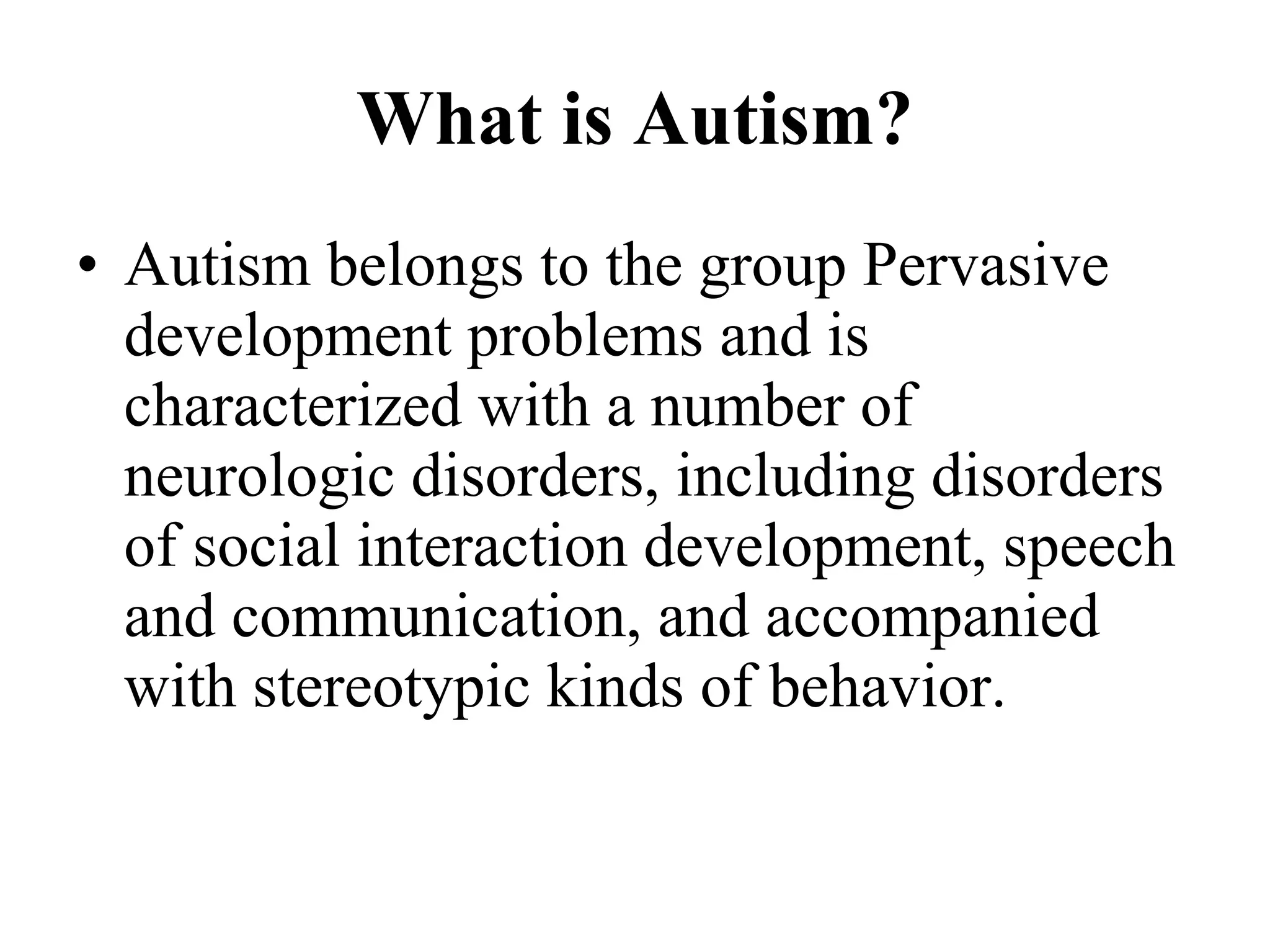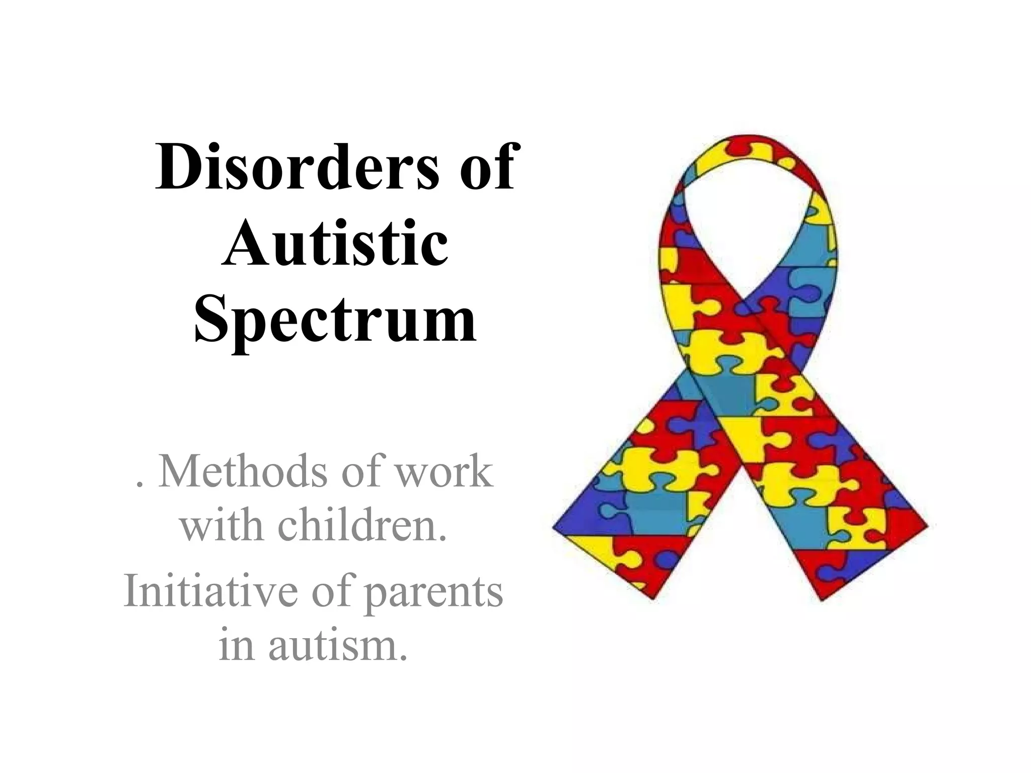 The document discusses autism spectrum disorders, highlighting their characteristics, classification, and diagnosis methods, emphasizing early recognition and interventions. It details various approaches for working with autistic children, addressing behavioral therapies, communication systems, and parental involvement. Additionally, the text underscores the necessity for societal awareness and support programs to aid families and improve educational strategies for children with autism.