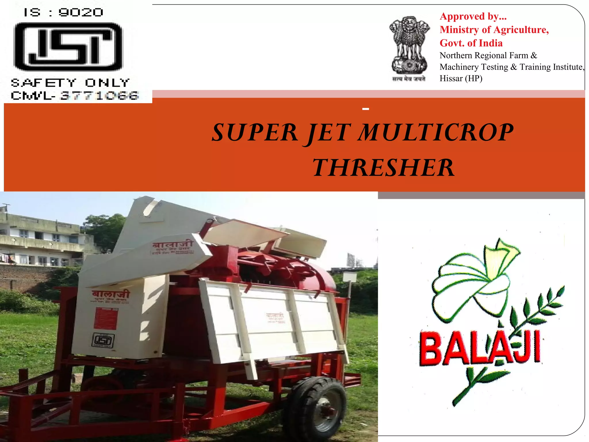 1) Types of threshing systems including manual, pedal, axial-flow, and Super Jet multicrop threshers. The Super Jet comes in single shaft, double shaft, and autofeeder models.