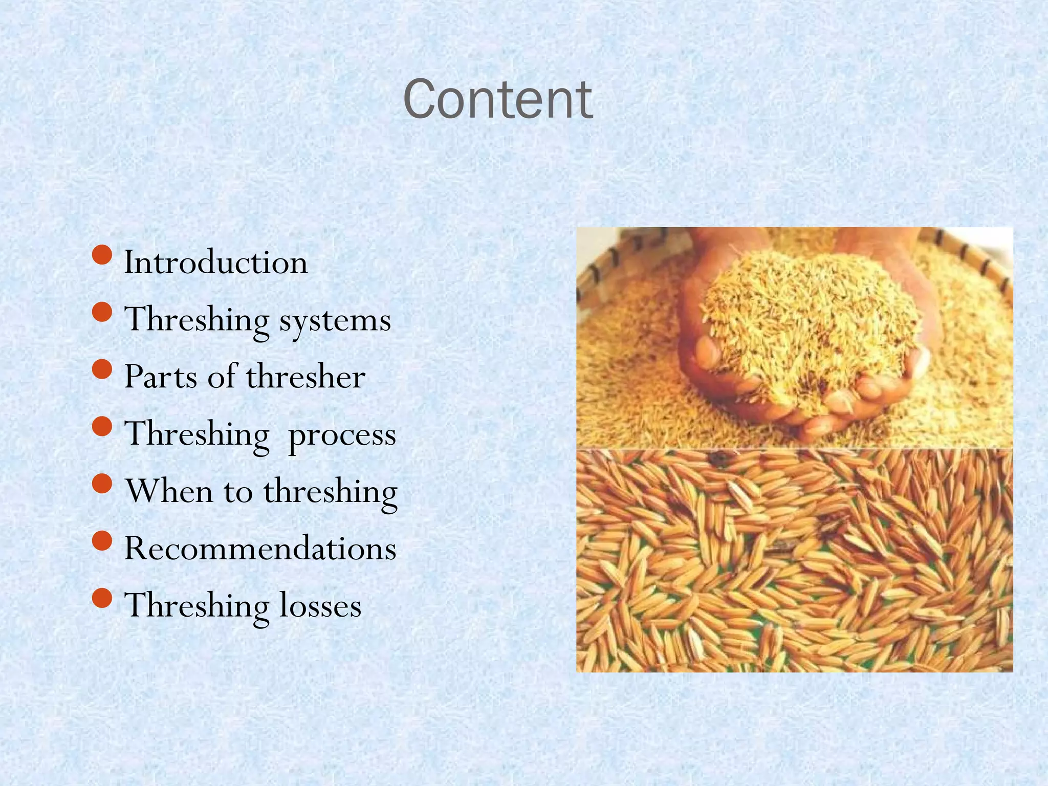 3) Recommendations for optimizing threshing such as using the proper machine settings and timing threshing based on crop moisture content. Tips are provided for both manual and machine threshing.