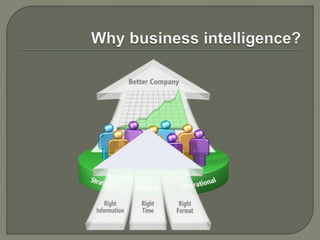 Business intelligence (BI) systems allow companies to gather, store, access, and analyze corporate data to aid in decision-making. These systems illustrate intelligence in areas like customer profiling, market research, and product profitability. A hotel franchise uses BI to compile statistics on metrics like occupancy and room rates to analyze performance and competitive position. Banks also use BI to determine their most profitable customers and which customers to target for new products.