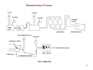 The document discusses the manufacture and properties of cement. There are two main processes for cement production - the dry process and wet process. In the dry process, raw materials are ground, dried, blended and fed into a kiln to form clinker. This process uses less water and energy than the wet process. The major chemical compounds in cement are tricalcium silicate, dicalcium silicate, tricalcium aluminate and tetracalcium aluminoferrite. Hydration reactions of these compounds produce strength-giving calcium silicate hydrates and calcium hydroxide. The type and proportions of compounds affect properties like strength development and heat evolution.