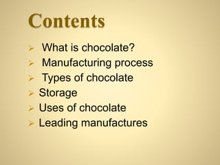 Chocolate is made from cocoa beans that are harvested, fermented, dried, roasted, and processed. The cocoa beans are cracked to extract nibs which are then ground into a paste. The paste is blended with sugar and other ingredients like milk or cocoa butter to make different types of chocolate. Chocolate is tempered and conched to give it a smooth texture and taste. It is then used to make chocolate bars, confections, drinks, and desserts. Leading chocolate manufacturers include Mars, Mondelez, Nestle, Hershey, Ferrero and Cadbury.