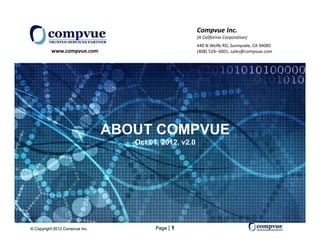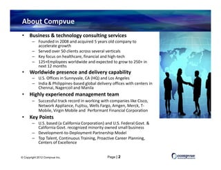 Compvue Inc., founded in 2008 and headquartered in Sunnyvale, California, provides business and technology consulting services across sectors, with a focus on healthcare, financial, and high-tech industries. The company operates globally with delivery centers in India and the Philippines and aims to expand its workforce from 125 to over 250 employees in the next year. They emphasize a service quality-driven approach, leveraging a highly experienced management team and advanced infrastructure to deliver IT consulting, resourcing, and business process outsourcing solutions.