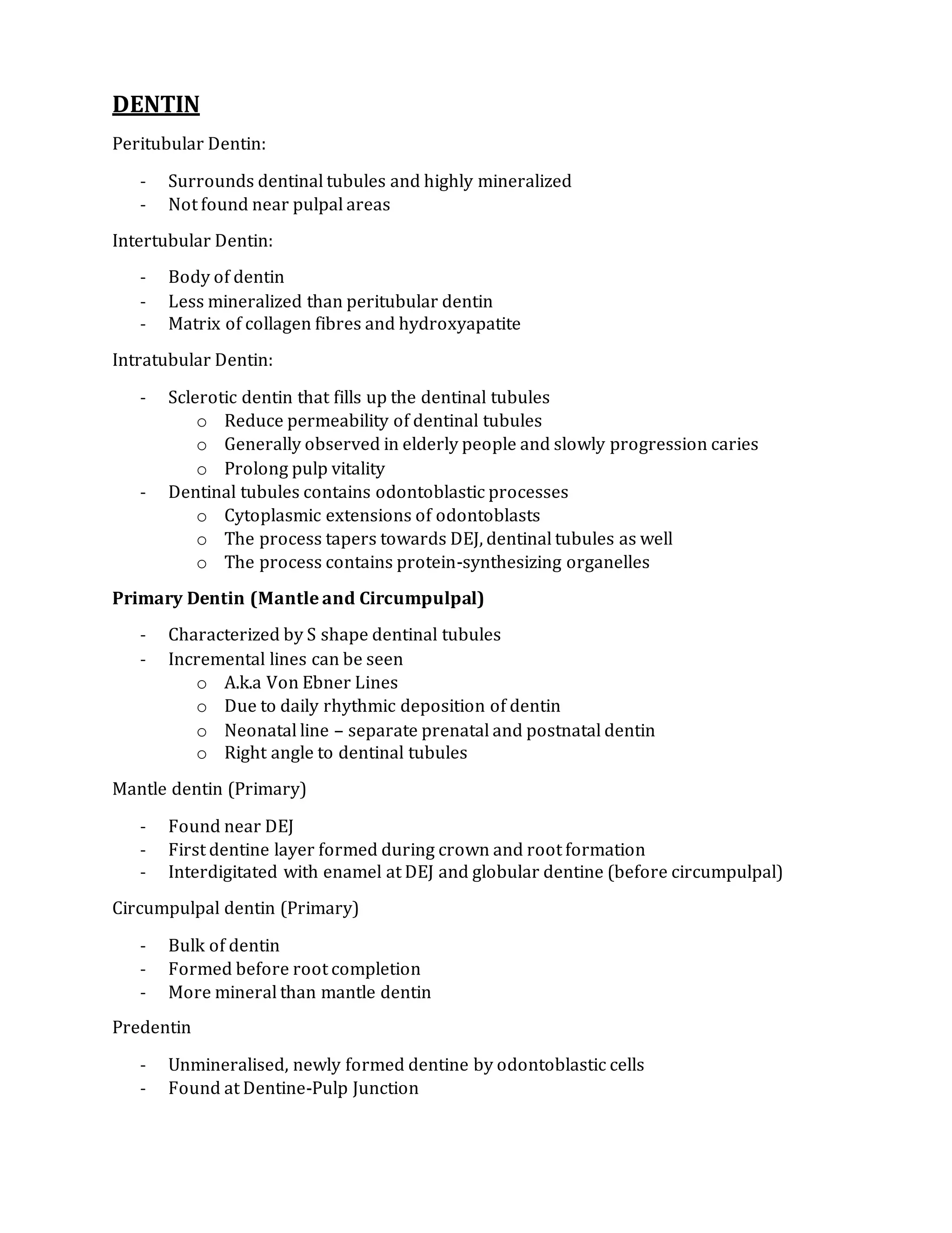 3) Primary dentin is characterized by S-shaped tubules and daily growth lines. Mantle dentin is near the enamel and circumpulpal dentin forms the bulk.