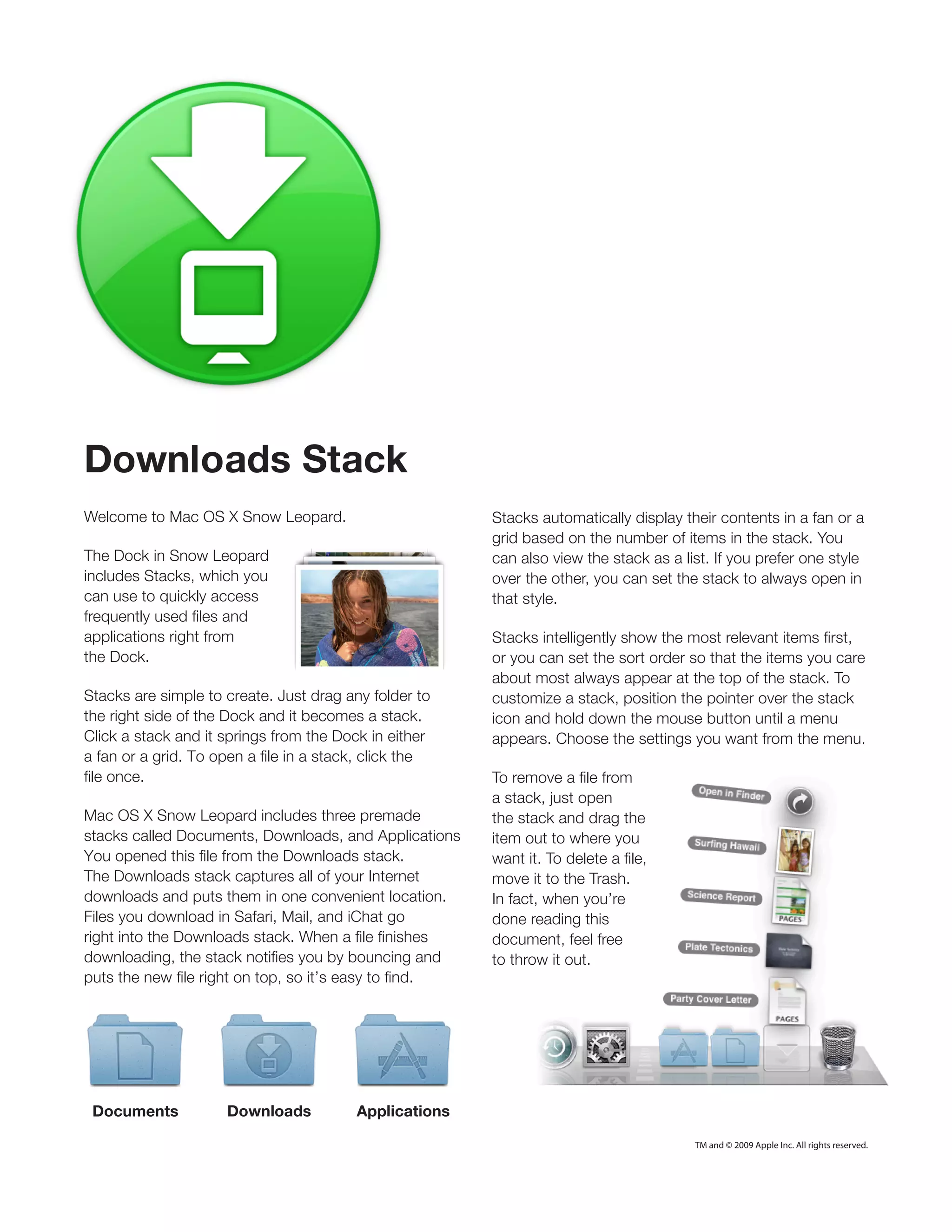 Stacks in Mac OS X Snow Leopard allow users to organize files and applications right from the Dock. Stacks can be created by dragging folders to the right side of the Dock. Clicking a stack will display its contents in a fan, grid, or list based on the number of items. The Downloads stack automatically collects all files downloaded from Safari, Mail, and iChat in one convenient location in the Dock.