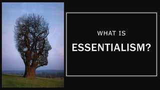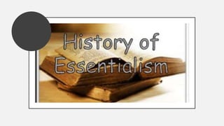 Essentialism is a philosophy that values the inherent essence or attributes that define what makes an entity fundamentally what it is. It postulates that objects in the real world are mere representations of abstract ideal forms. As an educational philosophy, essentialism believes students should learn traditional basic subjects thoroughly by installing them with the "essentials" of academic knowledge through a teacher-centered approach where the teacher interprets the essential learning process and sets the tone in the classroom. Criticisms of essentialism include that it allows for little student freedom or creativity, though it does provide a strong foundation of basic knowledge and skills.
