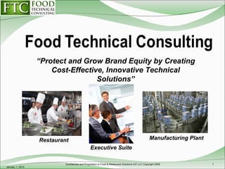 Food & Restaurant Solutions Int'l LLC provides innovative technical consulting services to protect and grow brand equity for clients in a cost-effective manner. They offer consulting in areas like product innovation, food safety systems, manufacturing and supply chain management, and legal expert witness services. The company brings expertise from research and development, quality assurance, food manufacturing, and supply chain management to develop solutions for their clients.