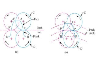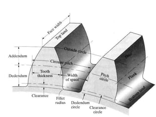 The document provides an in-depth overview of gears, including types such as spur, helical, bevel, and worm gears, describing their applications, advantages, and disadvantages. It also covers manufacturing methods, nomenclature, design considerations like backlash and contact ratio, and gear trains. Additionally, the document explains interference in gears and methods to eliminate it while highlighting the importance of gears in power transmission systems.
