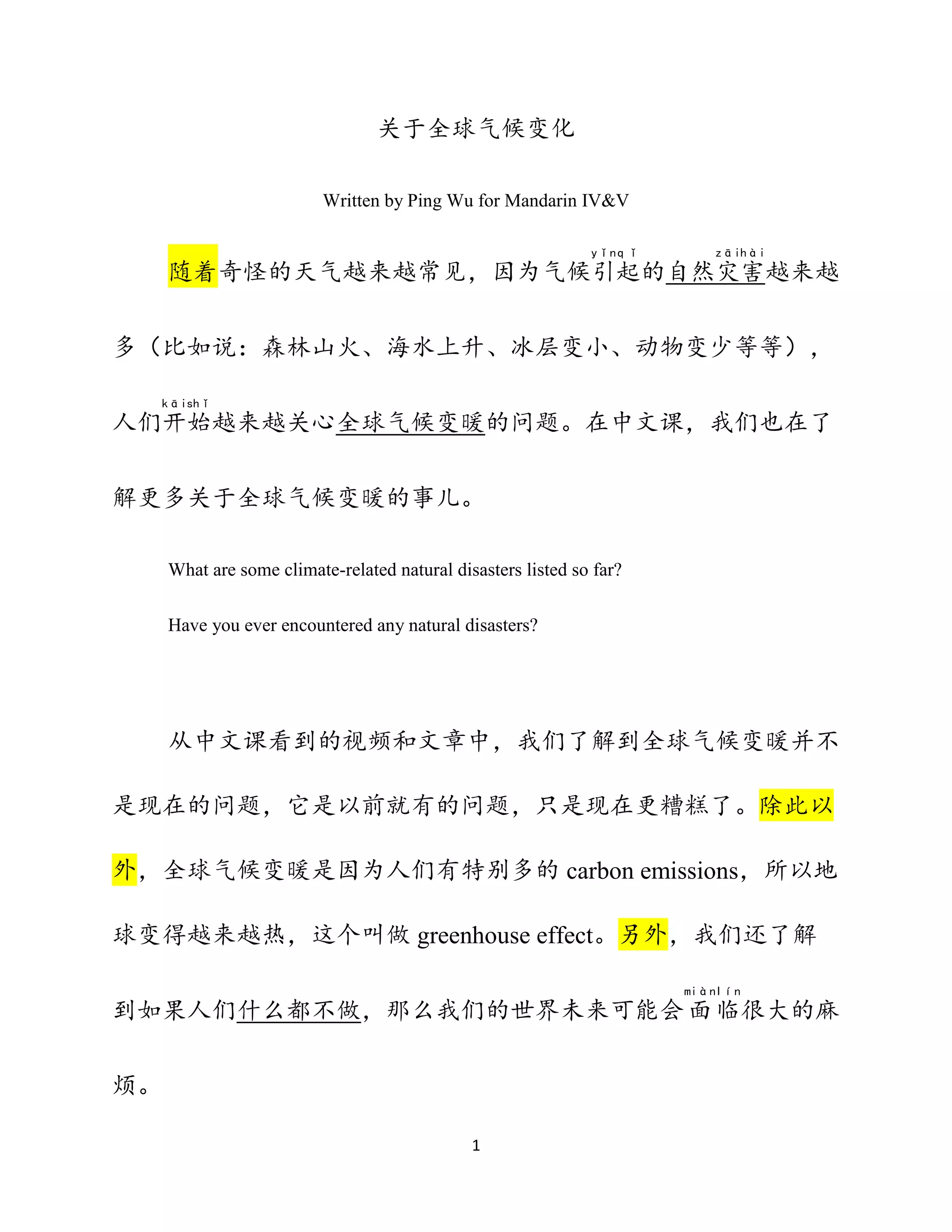 越来越关心全球气候变暖的问题。在中文课,我们也在了