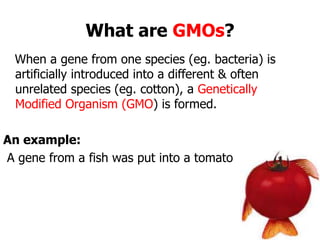 The document discusses genetically modified organisms (GMOs), specifically highlighting that genetically modified crops do not significantly increase yields, contrary to claims by the biotech industry. It also argues that herbicide-resistant crops lead to increased pesticide use and questions the safety and health implications of GMOs, noting studies indicating potential health risks. The document calls for consumer awareness and action against proposed legislative changes in India that could limit regulation and labeling of GM crops.