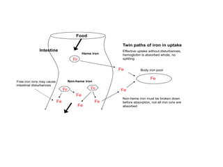 There are two types of iron in the diet: heme iron found naturally in meat which is efficiently absorbed by the body, and non-heme iron found in plants which must be broken down before absorption and often causes gastrointestinal side effects. Heme iron supplements containing bovine hemoglobin provide a natural form of iron that is easily absorbed without side effects, unlike synthetic non-heme iron supplements which are poorly absorbed and commonly cause issues. A Swedish company produces heme iron supplements that effectively treat iron deficiency without the problems of existing non-heme supplements.