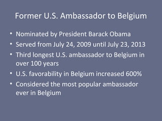 Howard Gutman served as the U.S. Ambassador to Belgium from 2009 to 2013, making over 100 TV appearances and visiting all 589 cities and communes in Belgium, increasing U.S. favorability 600%. Previously, Gutman was a partner at a prominent Washington D.C. law firm for over 26 years, handling litigation in various fields. He now leads The Gutman Group, an international consulting firm focused on energy, finance, infrastructure and other strategic policy issues.