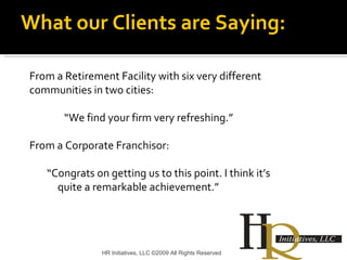 1. The document is from a human resources consulting firm called HR Initiatives, LLC that provides various HR services to help businesses grow profitably by effectively managing their employees.