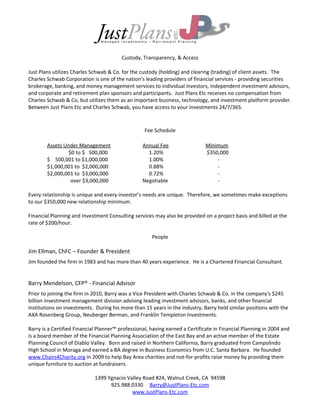 Just Plans Etc is a fee-only wealth management firm founded in 1983 that provides financial planning and investment advisory services to over 100 clients. The firm specializes in tax-efficient investing and helping investors realize value from various equity holdings. Founder Jim Ellman and Barry Mendelson together have over 50 years of experience in growing, managing, and protecting clients' wealth. The firm provides comprehensive wealth management services including investment management, financial planning, retirement planning, and estate planning using primarily low-cost mutual funds and ETFs.