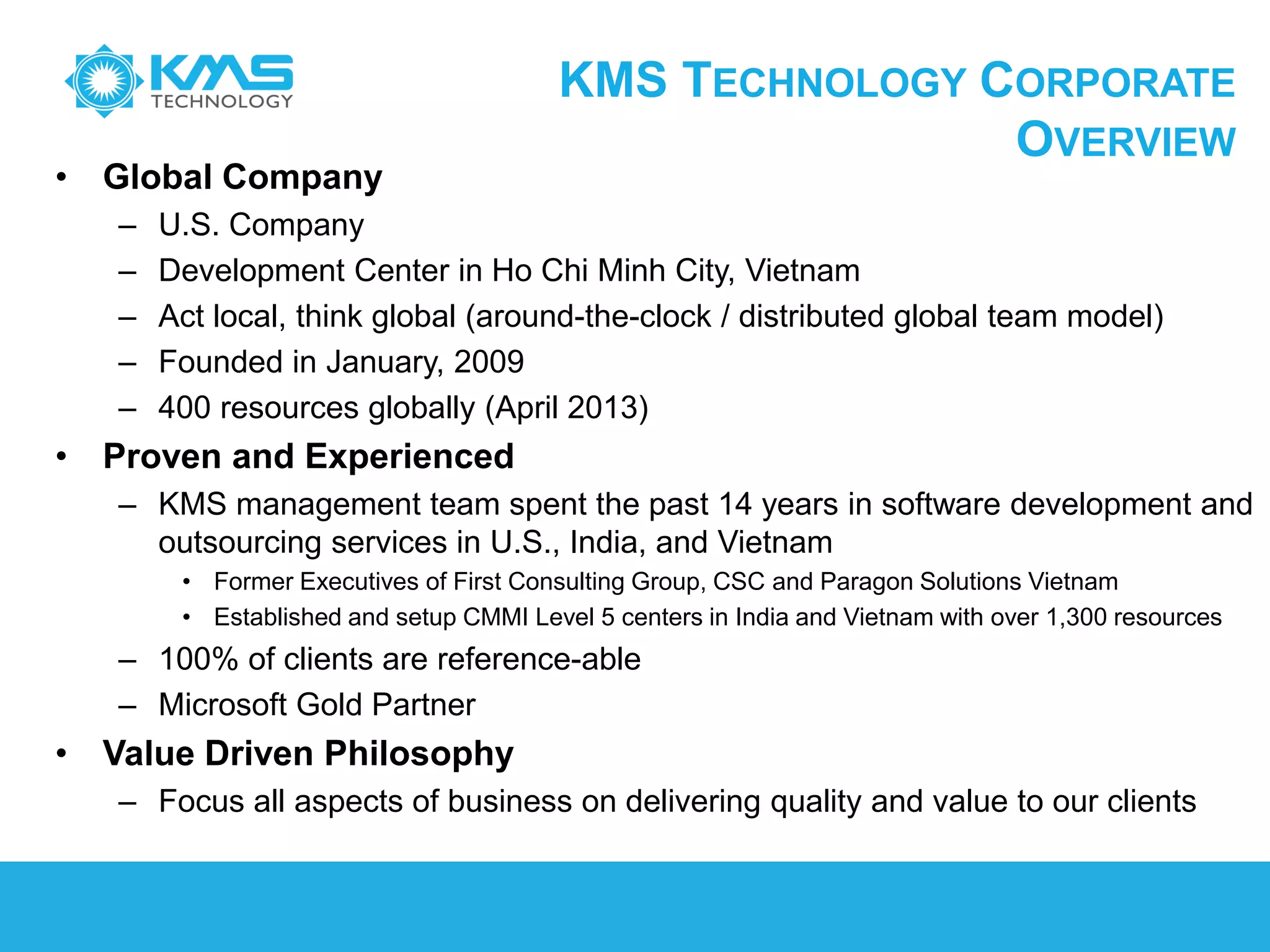 KMS Technology, founded in January 2009, is a global software development and outsourcing company based in the U.S. with a development center in Ho Chi Minh City, Vietnam, employing around 400 people as of April 2013. The management team has extensive experience in the industry, and KMS has achieved CMMI Level 5 certification while maintaining a focus on high quality and client satisfaction. They also emphasize recruitment, community involvement, and personal development within the company.