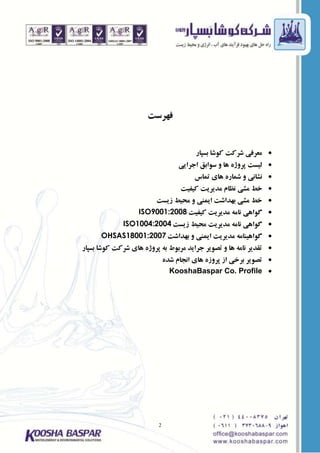 Koosha Baspar Jonoob Company (Trade Mark: Koosha Baspar) started its activities in the summer of 1999. Given the co-operation of managers and experience of the experts within the company, Koosha Baspar has managed to render unique services and supply distinctive systems and goods to heavy industries in the country such as Oil and Gas, Steel, Agro-culture and etc. Koosha Baspar has focused on the Water and Wastewater Industry with particular emphasis on protection of the environment, and has come up with solutions in the following fields: