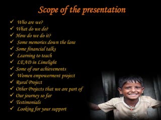 Lead Foundation is a volunteer-driven NGO based in Navi Mumbai, focused on educating underprivileged children and empowering women in local communities. Since its establishment in 2008, the organization has successfully enrolled over 70 children in municipal schools, supported women's skill development initiatives, and expanded efforts to tribal villages. The foundation seeks support and donations to continue its mission of transforming lives through education and community involvement.