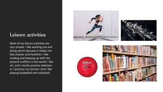 Sofia enjoys several leisure activities including working out, reading about current events, practicing art such as sketches and clarinet, and playing basketball and volleyball. She has a small friend group that she is comfortable opening up to as an introvert. Her clothing style reflects her unique way of thinking and draws from 1990s trends rather than current fashions. Sofia enjoys a variety of music genres from the 1990s as well as artists like Tobi Lou, Fall Out Boy, Billie Eilish, and AJR. Her favorite foods include pasta, ramen, rice, vegetables, and fruits because of their versatility in combinations.