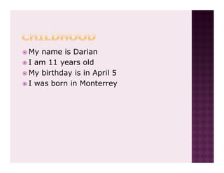 This document introduces an 11-year-old boy named Darian. It provides details about his family, including his parents and two sisters. It describes his past pets and schools. It also lists his favorite foods, activities, friends, music, movies, places to eat, places visited, colors, and books.